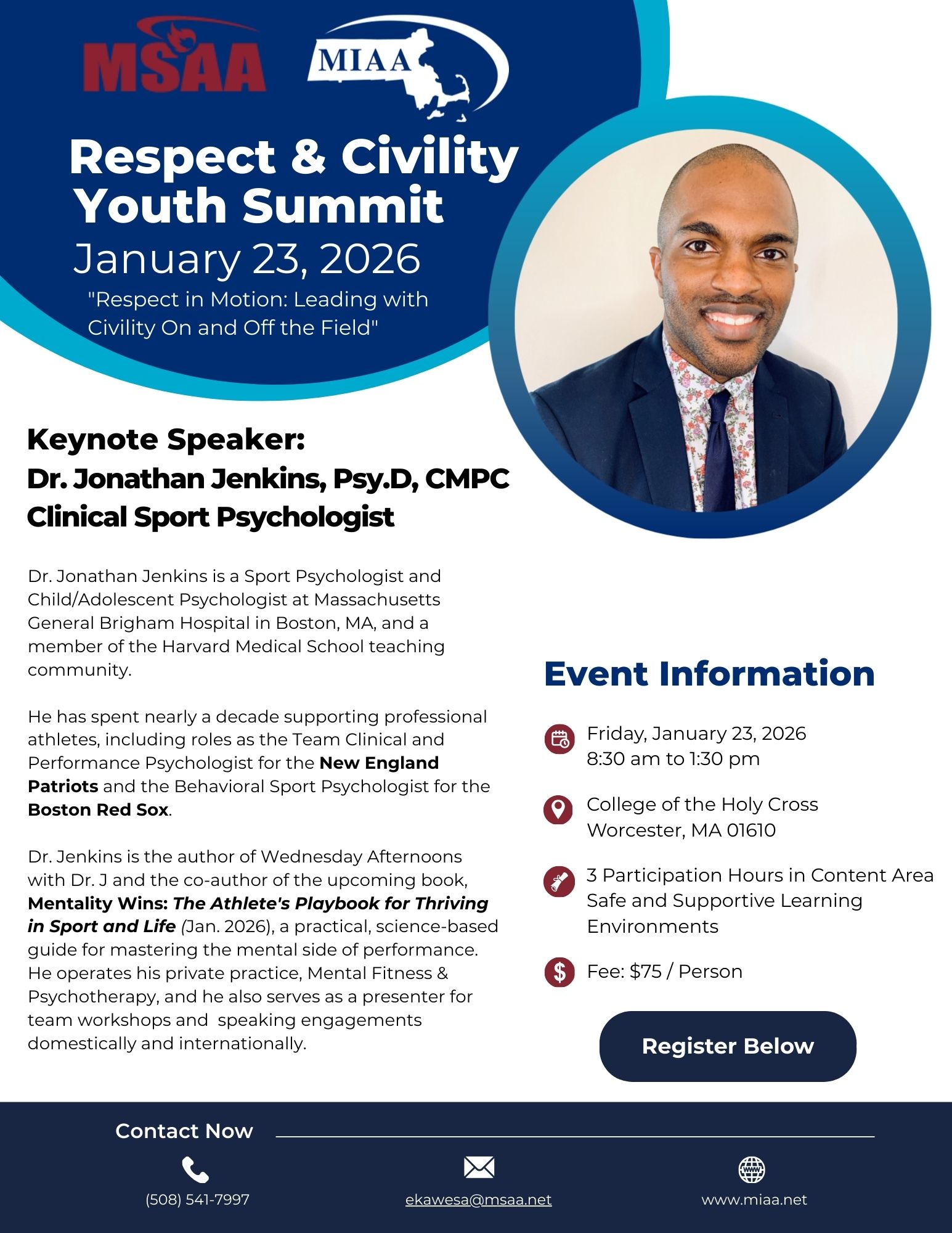 MSAA/MIAA Respect and Civility Youth Summit January 23rd, 2026 8:30 am - 1:30 pm College of the Holy Cross, Worcester, MA share this Share this on Twitter Share this on Facebook Share this via email Copy this Register Today Related Events Conferences and Workshops Dec 2 Workshop: Quality Physical Education Program: How it integrates with other subjects Conferences and Workshops Dec 5 Workshop: The Organized Educator: Strategies to Maximize Your Time Conferences and Workshops Jan 22 Workshop: Lights! Camera! Action! Setting the Stage for a Positive Climate and Culture in Our Schools